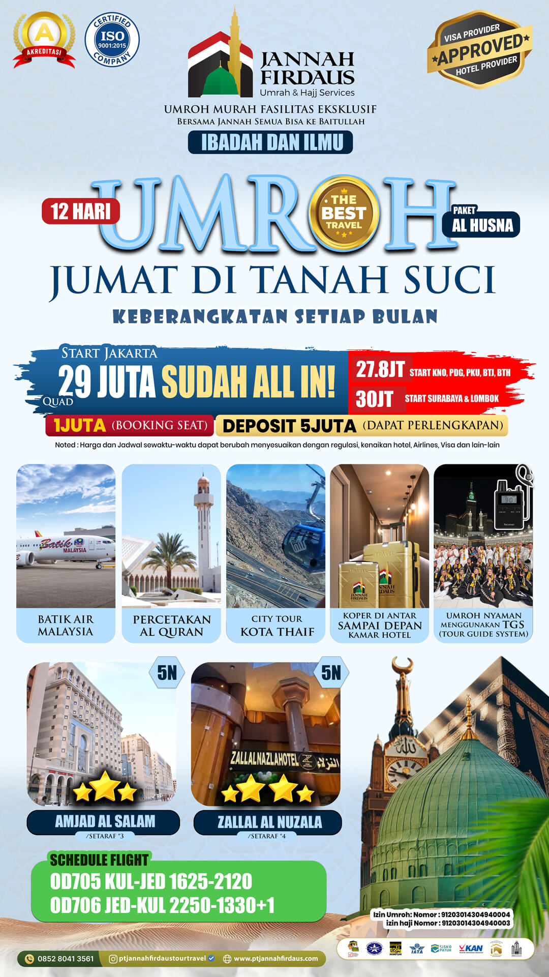 Itinerary Paket Umroh Alhusna Surabaya Program umrah 12 Hari Keberangkatan Bandara Juanda Surabaya Jawa Timur Jannah Firdaus Tour Travel.