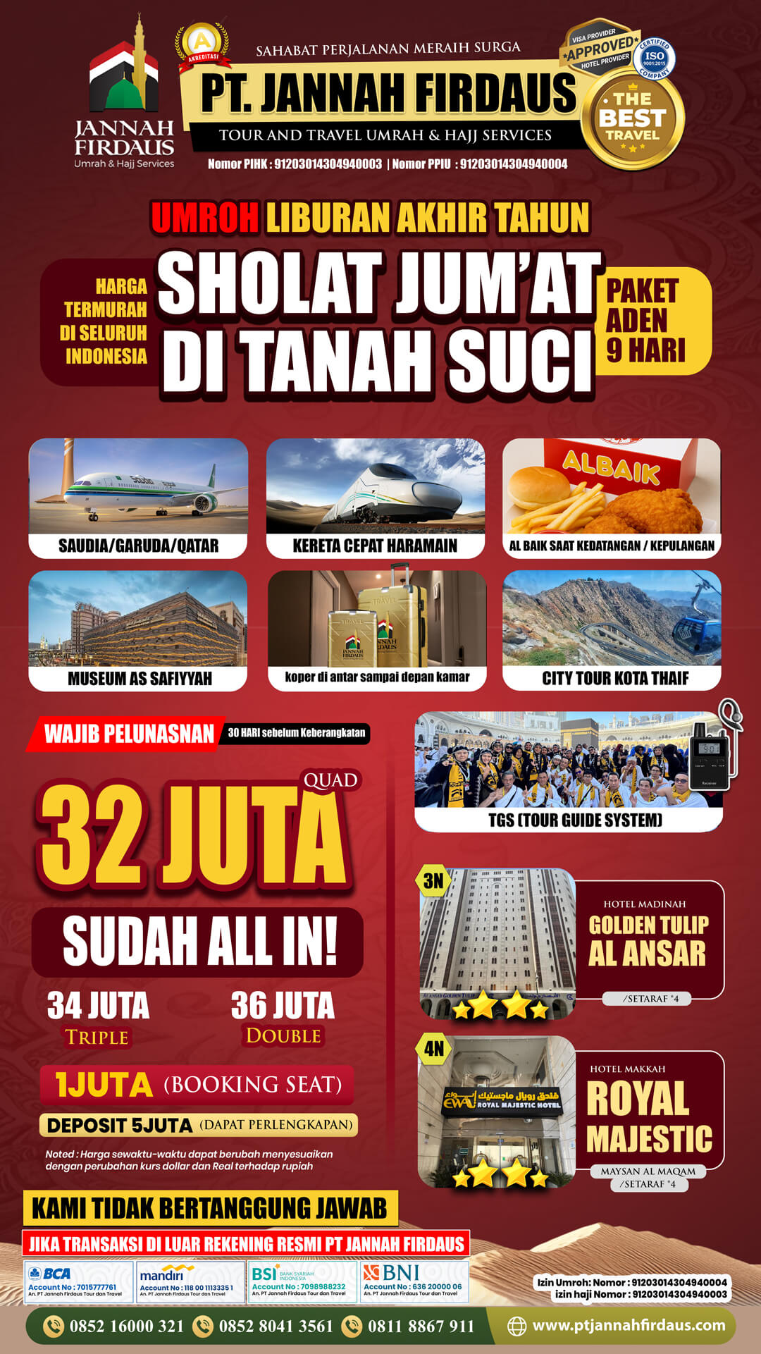 Itinerary Paket Aden 9 Hari Umrah Akhir Tahun 2025 PT Jannah Firdaus Keberangkatan Bandara Soekarno Hatta Jakarta.