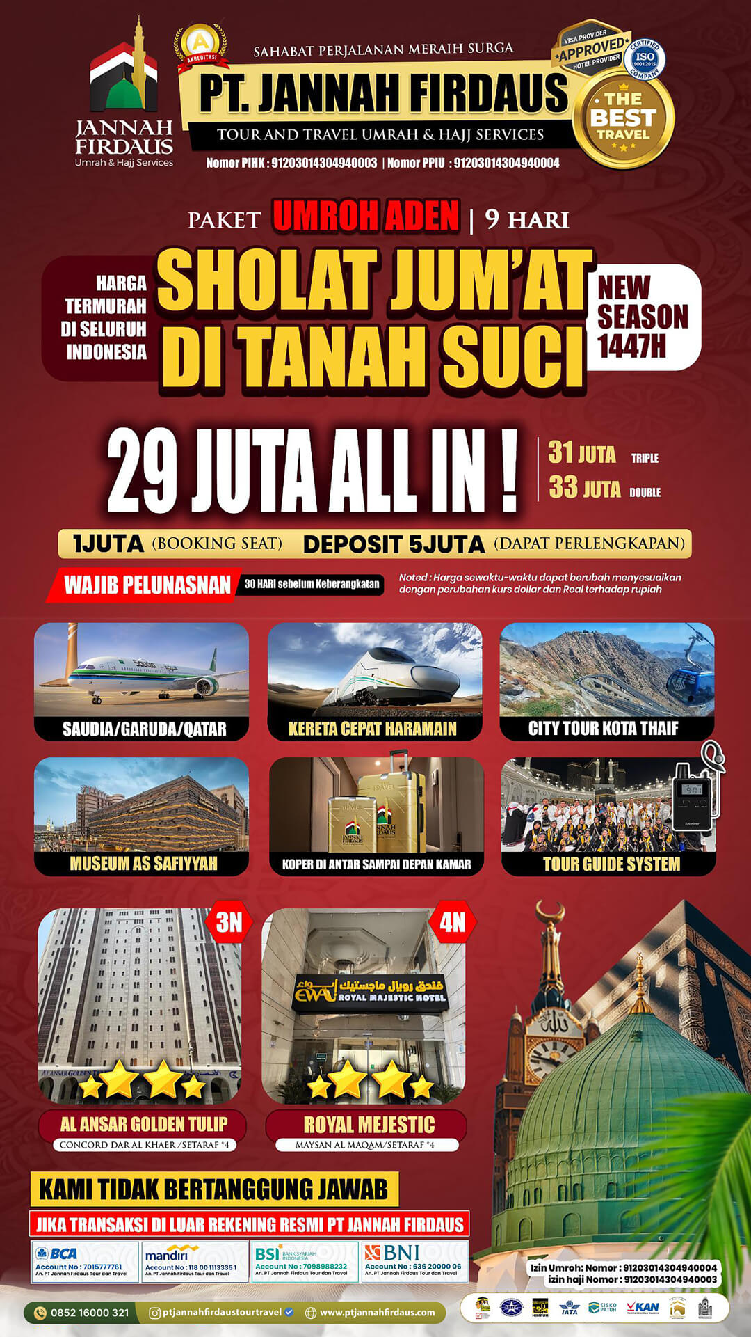 Itinerary Paket Umroh Bulan Agustus Aden 2026 Jannah Firdaus Keberangkatan Bandara Soekarno Hatta Jakarta.