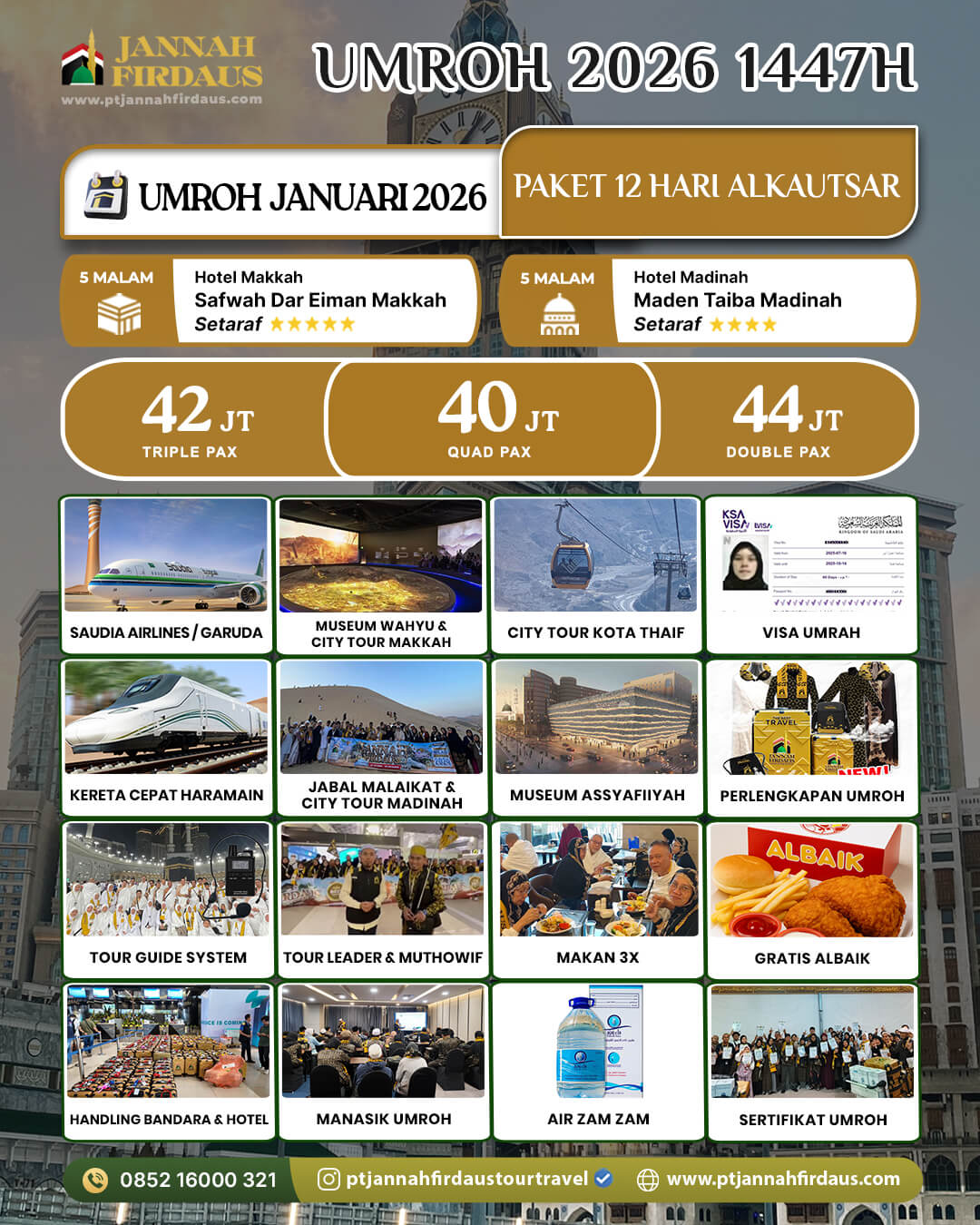 Itinerary Paket Alkautsar 12 Hari Umroh Januari 2026 PT Jannah Firdaus Keberangkatan Bandara Soekarno Hatta Jakarta.