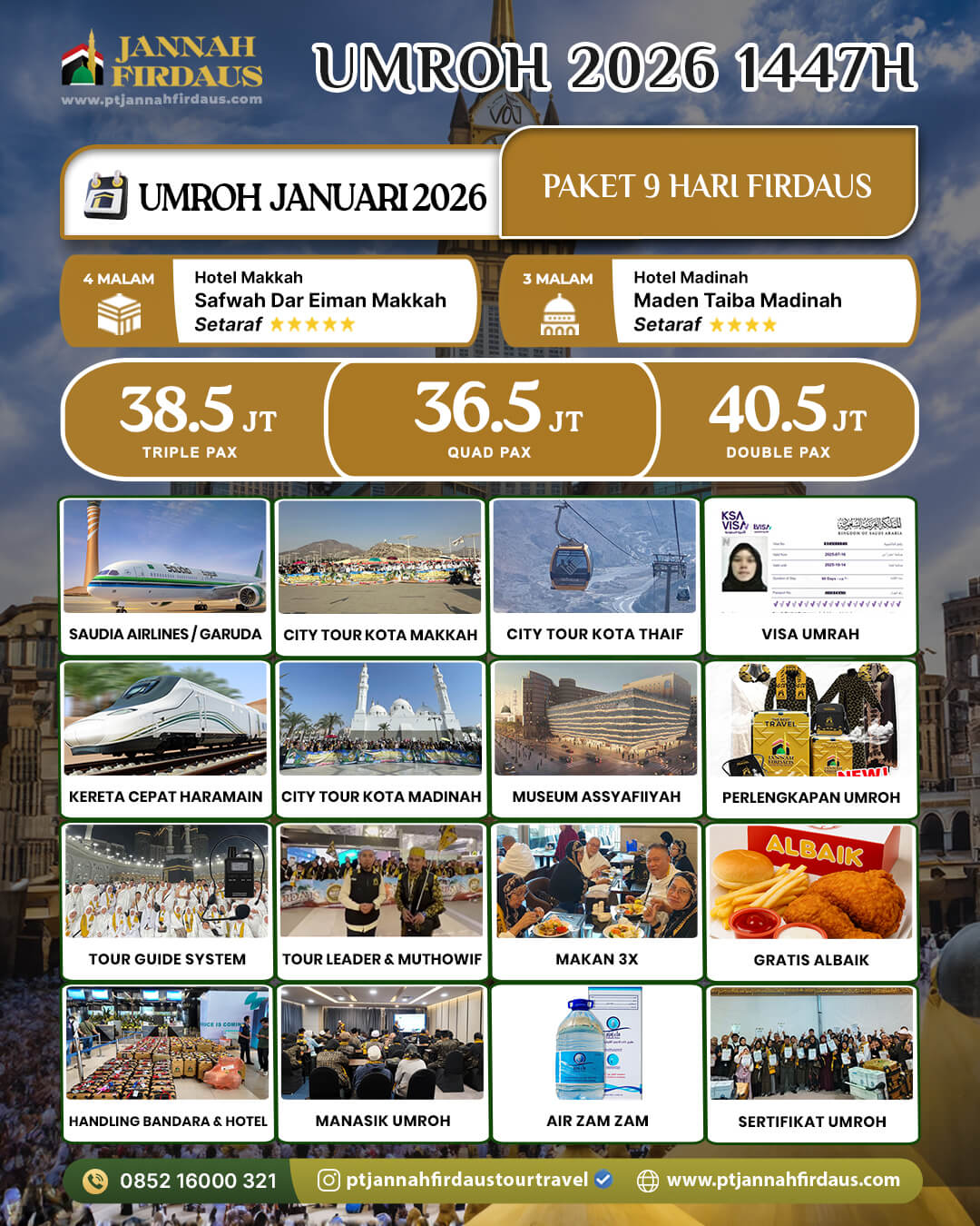 Itinerary Paket Firdaus 9 Hari Umroh Januari 2026 PT Jannah Firdaus Keberangkatan Bandara Soekarno Hatta Jakarta.