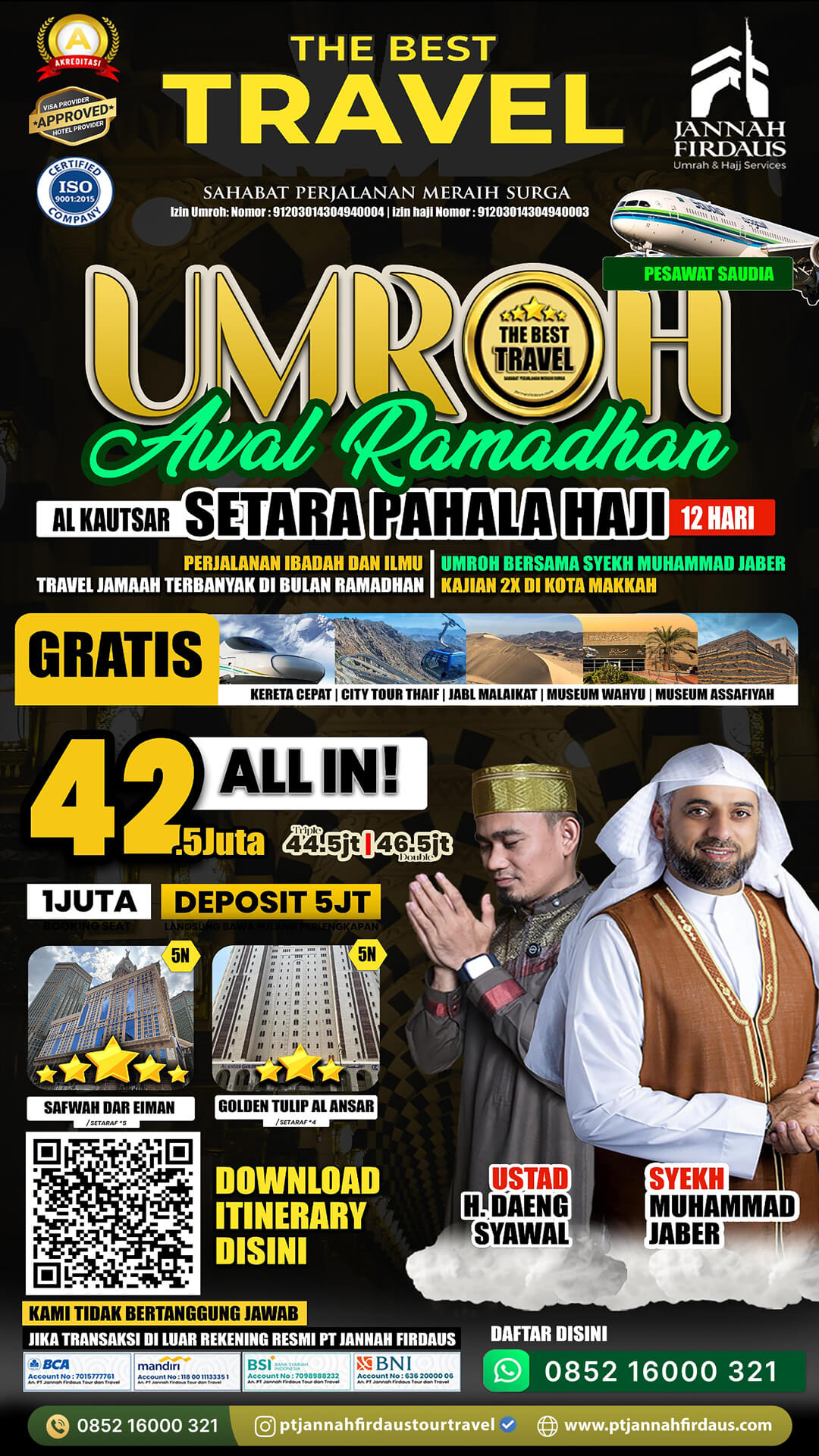 Itinerary Paket Umroh Awal Ramadhan 2026 Alkautsar durasi 12 hari Jannah Firdaus Tour Travel.