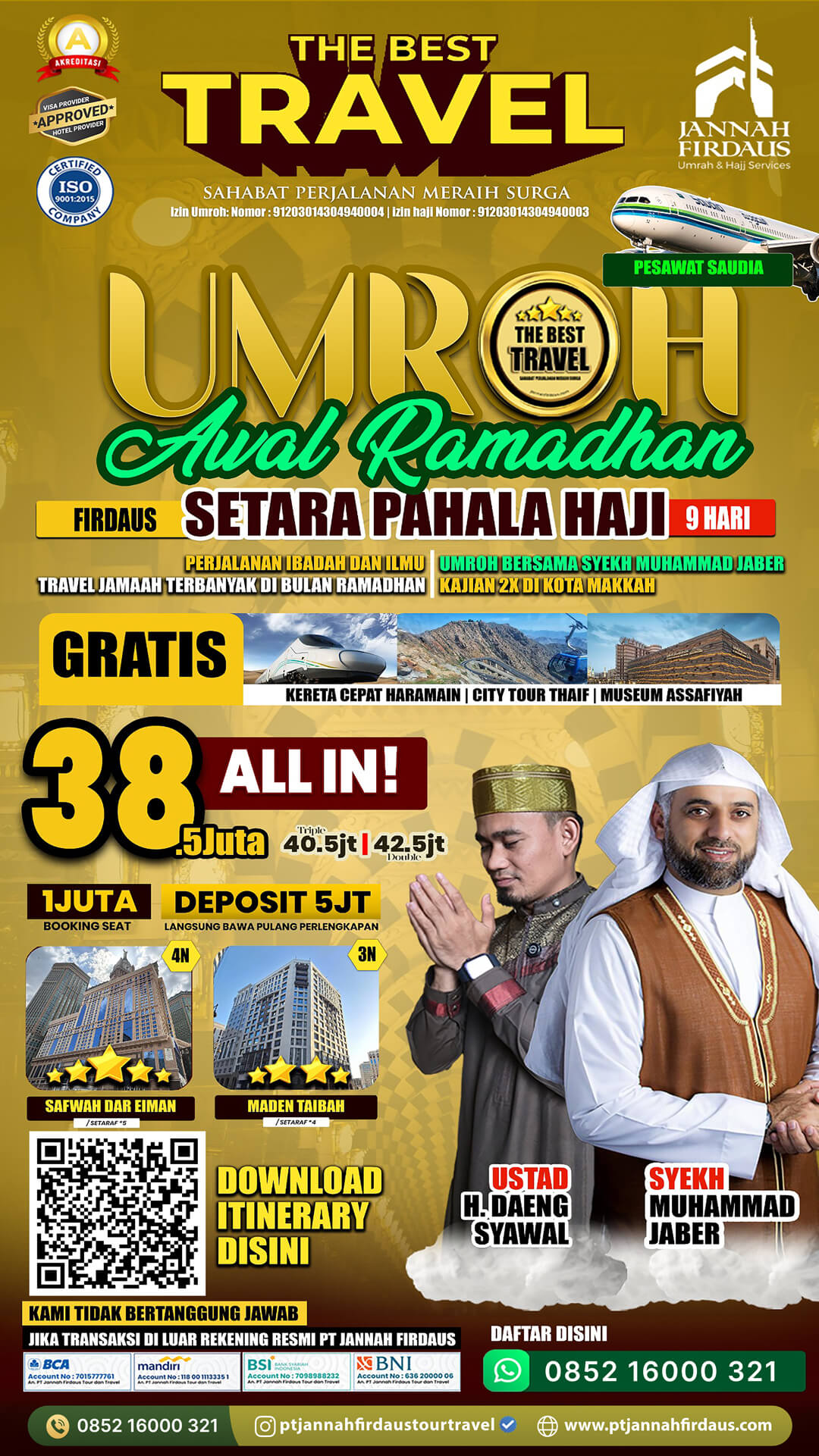 Itinerary Paket Umroh Awal Ramadhan Firdaus 9 Hari Plus Thaif dan Kereta Cepat Haramain Jannah Firdaus Tour Travel.