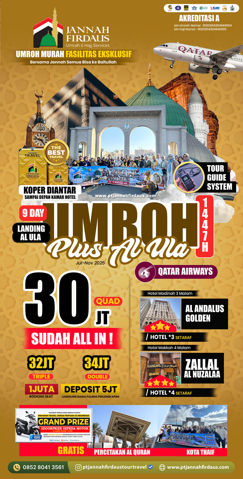 Itinerary Paket 9 Hari Umrah Plus Al Ula 2026 PT Jannah Firdaus Keberangkatan Bandara Soekarno Hatta Jakarta.