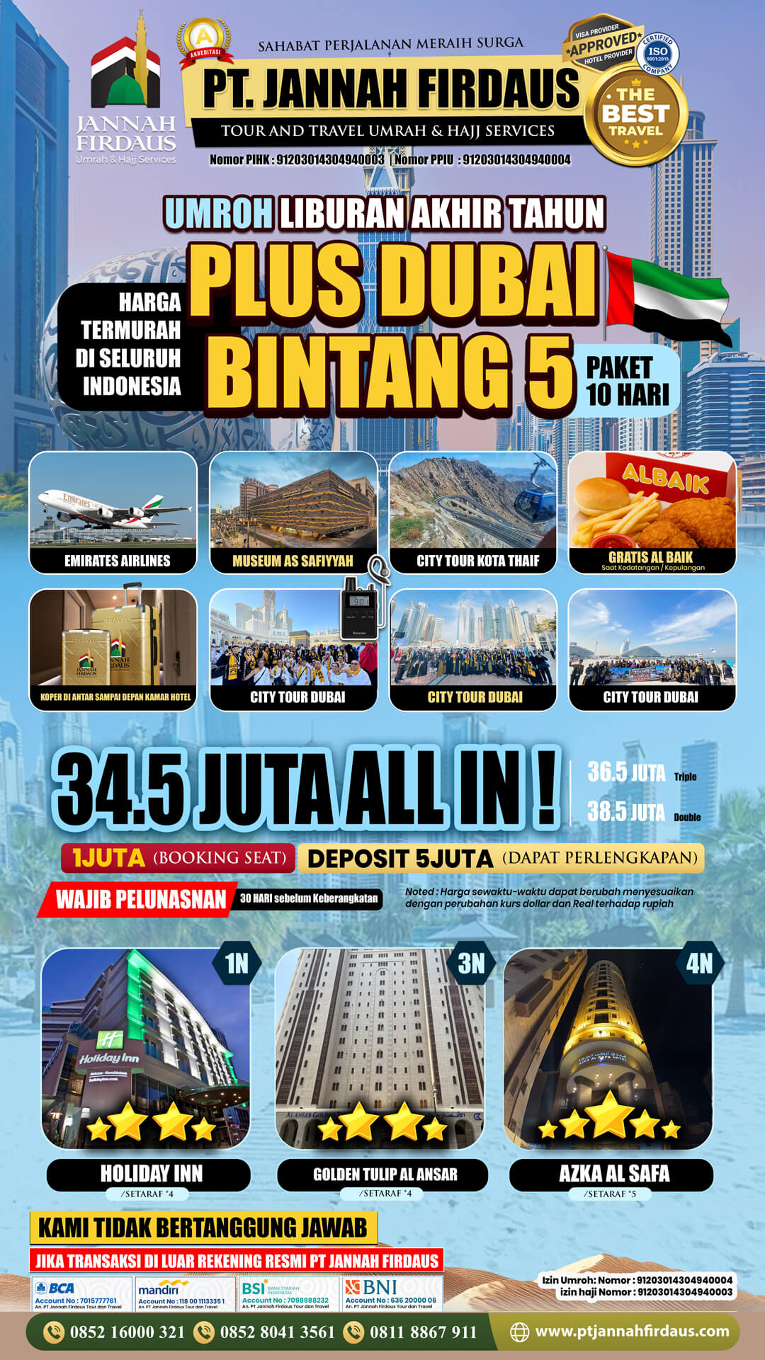 Itinerary Umroh Plus Dubai PT Jannah Firdaus Tour Travel Keberangkatan Bandara Soekarno Hatta Jakarta.