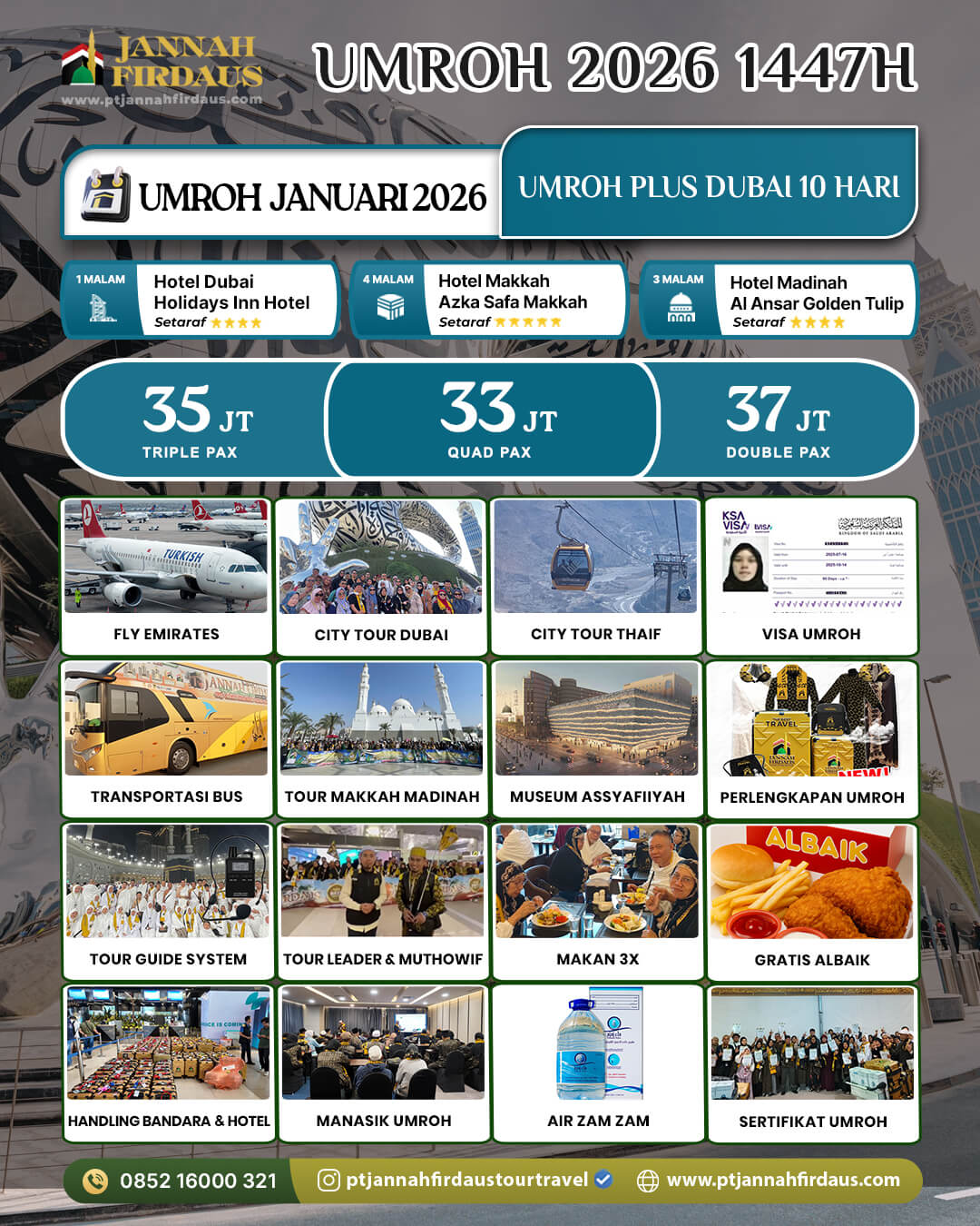 Itinerary Umroh Plus Dubai PT Jannah Firdaus Tour Travel Keberangkatan Bandara Soekarno Hatta Jakarta.