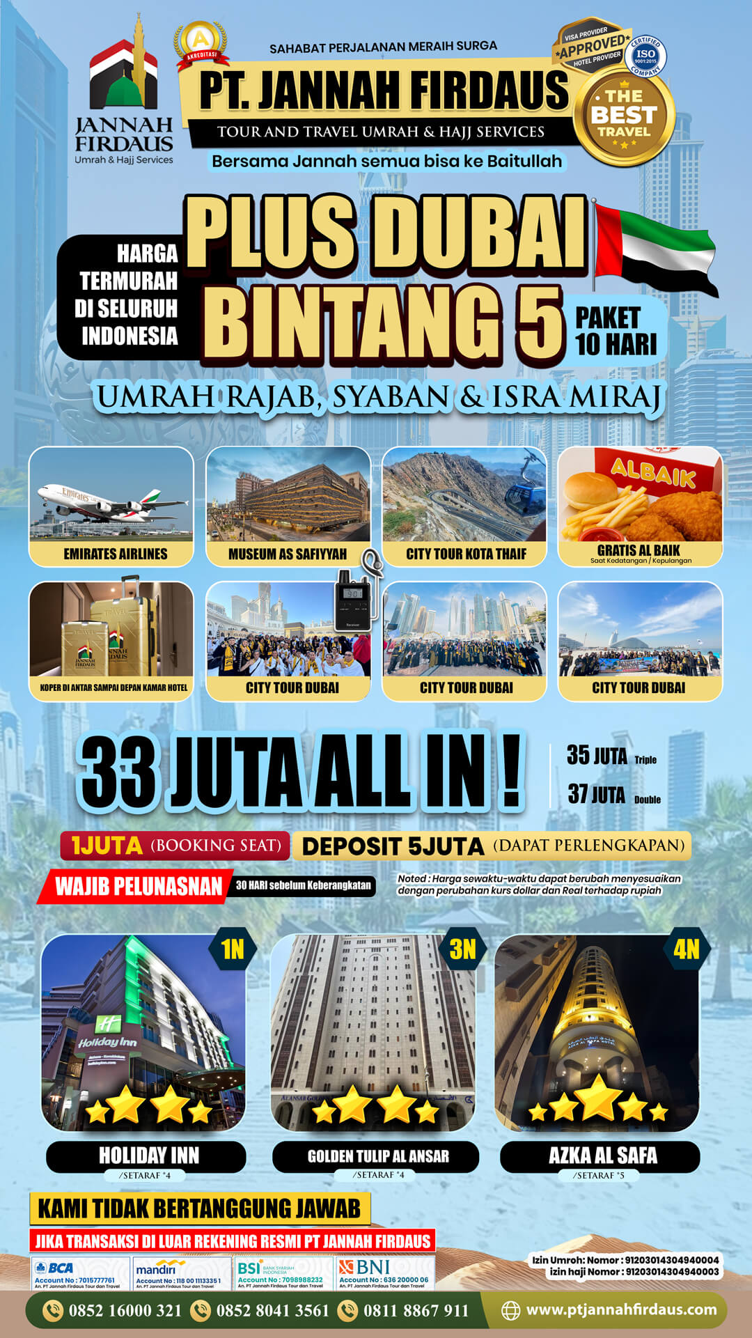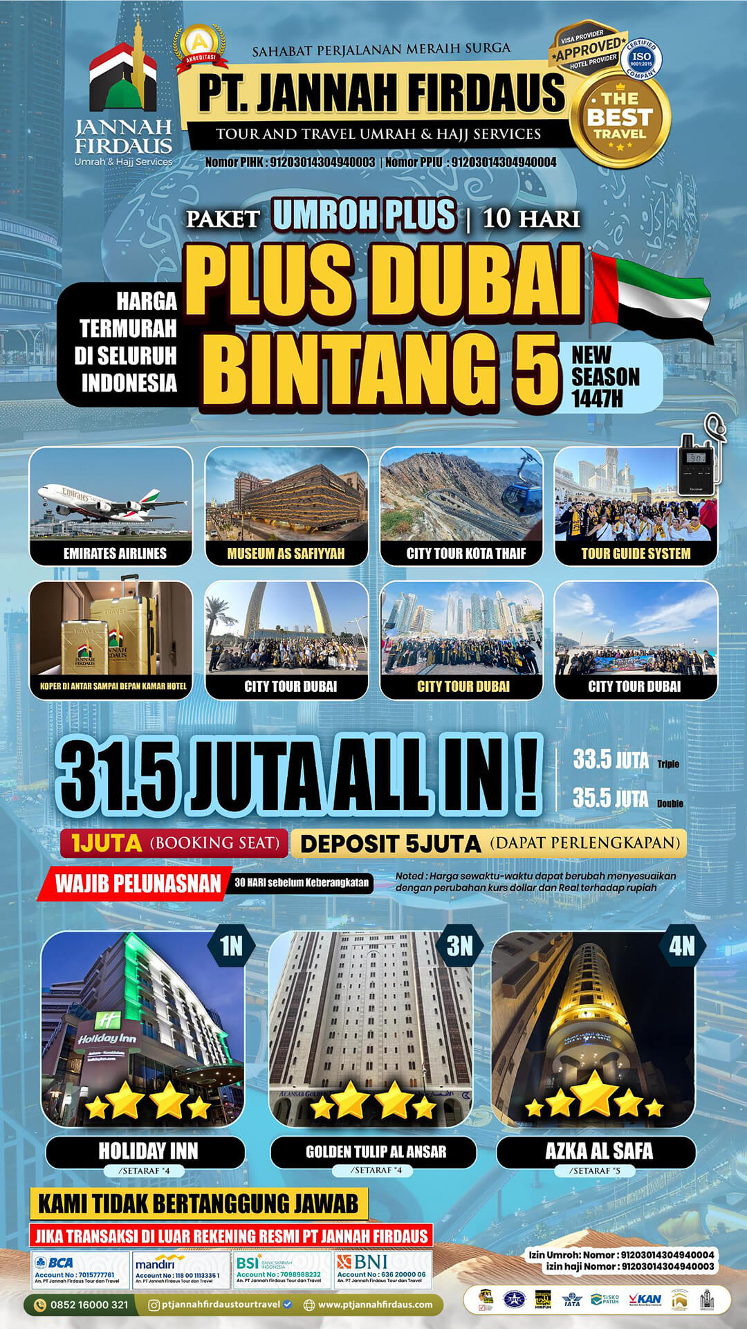Itinerary Umroh Plus Dubai Jannah Firdaus Tour Travel keberangkatan Bandara Soekarno Hatta Jakarta dengan Maskapai Emirates Airlines.